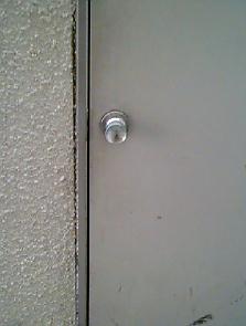 私の職場の高校にある物置のドアです。写真ではわかりにくいのですが、妙なことに鍵(ちゃんとキーを使うタイプです)が内側からしか掛けられません。この地帯の掃除監督をしていて気がつきました。